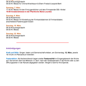 08.03.2026, 09:00 Uhr Familienmesse zum 3. Fastensonntag mit Vorstellung der FirmkandidatInnen, anschl. Fastensuppenessen Pfarrkirche Viehofen
