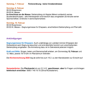15.02.2026, 09:00 Uhr Segnungs - und Jubiläumsmesse für Ehepaare, anschl. Pfarrcafé mit Sektempfang Pfarrkirche Viehofen